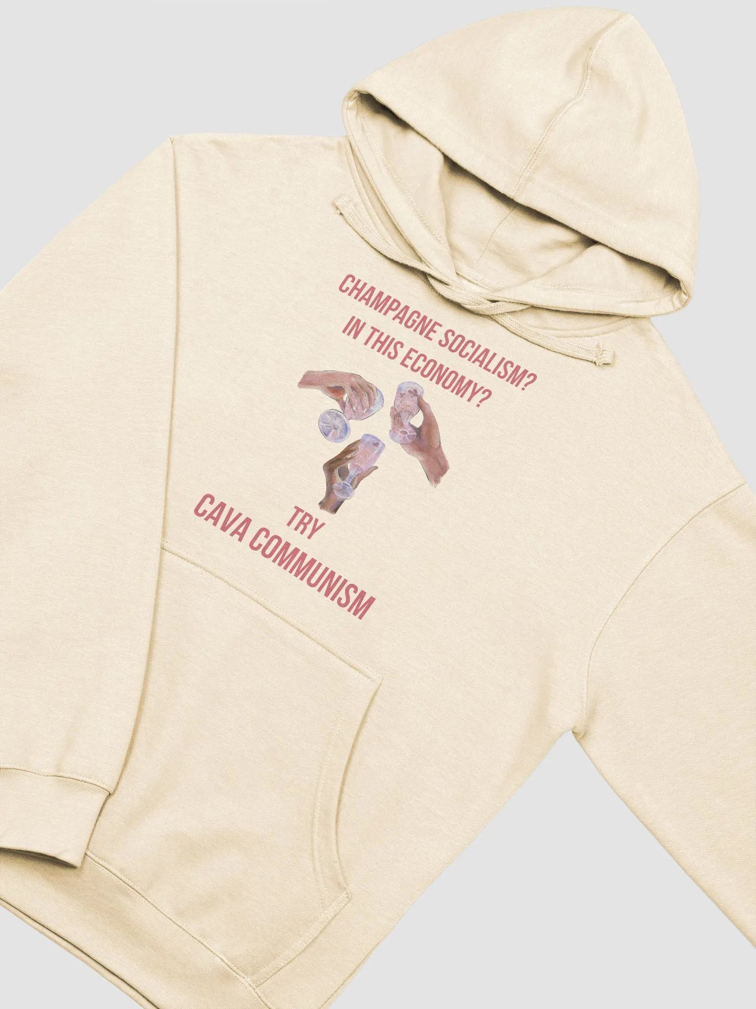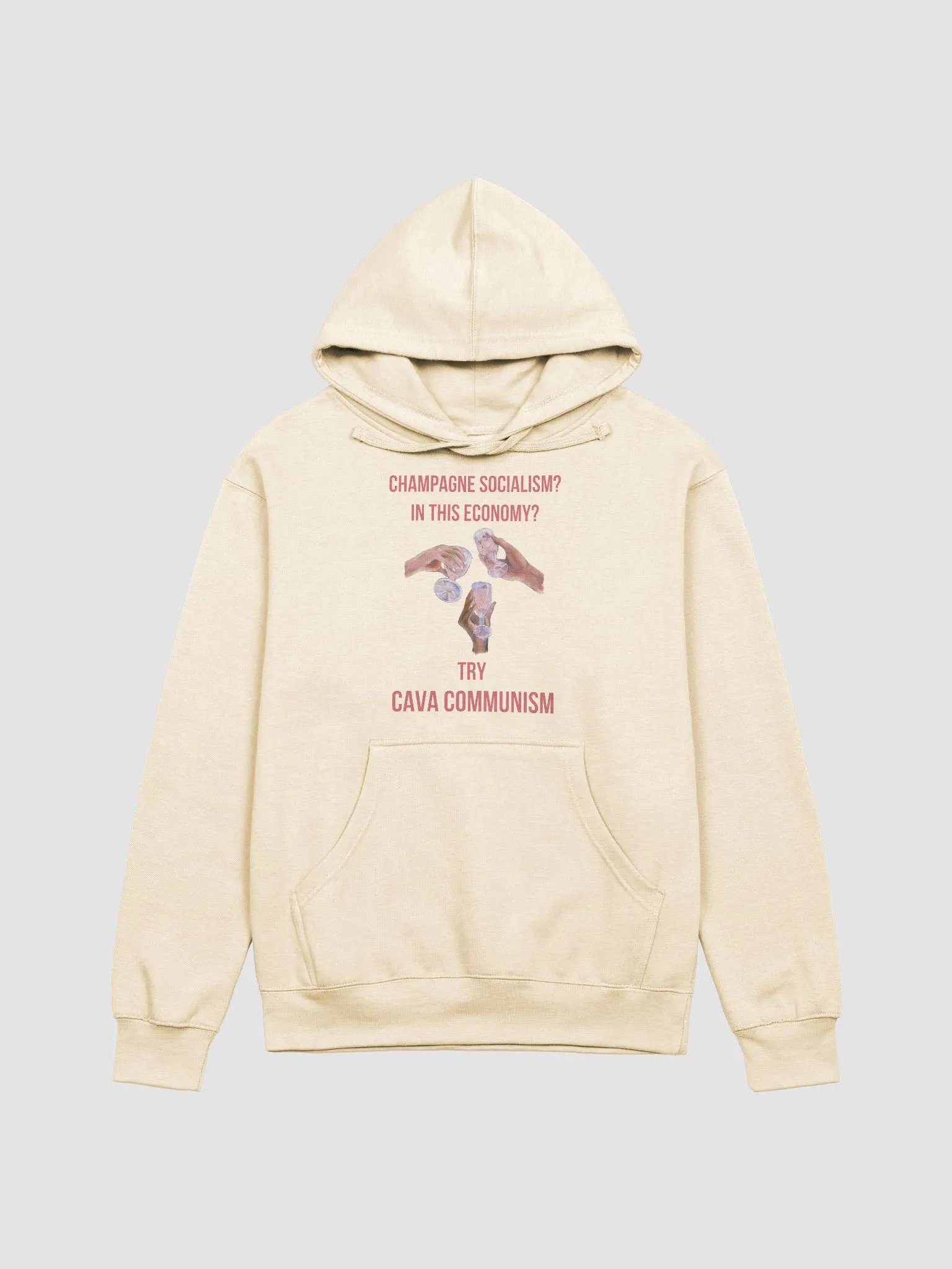 Raise a glass to bold statements and humor with this cozy hoodie featuring hands toasting with glasses and the words "Champagne Socialism? In This Economy? Try Cava Communism."