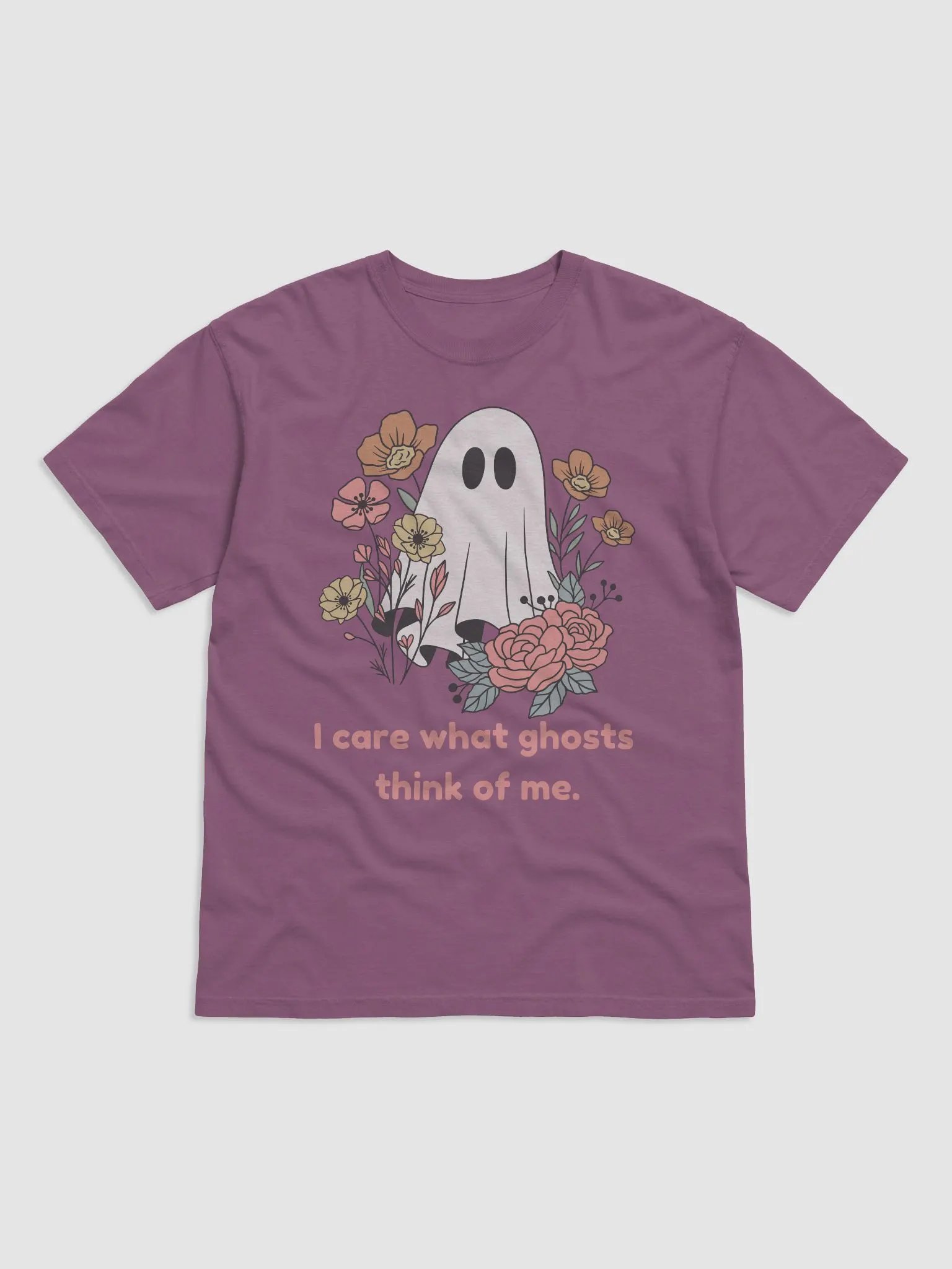 Show off your spooky yet sweet side with this playful t-shirt featuring an adorable ghost surrounded by flowers and the words "I Care What Ghosts Think of Me." Perfect for those who like mixing charm with a supernatural touch.