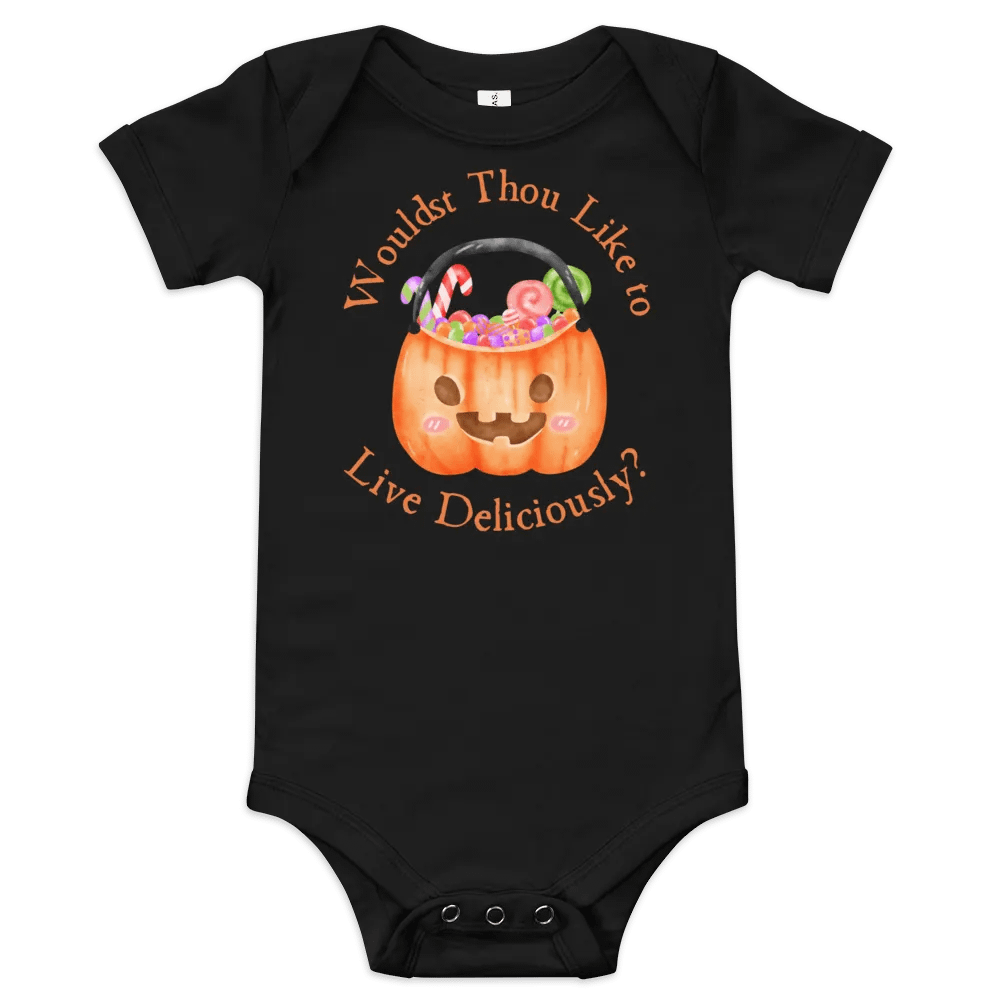 Celebrate Halloween with this adorable bodysuit featuring a jack-o'-lantern candy bucket and the words "Wouldst Thou Like to Live Deliciously?" Perfect for babies who are ready to join in the spooky fun.